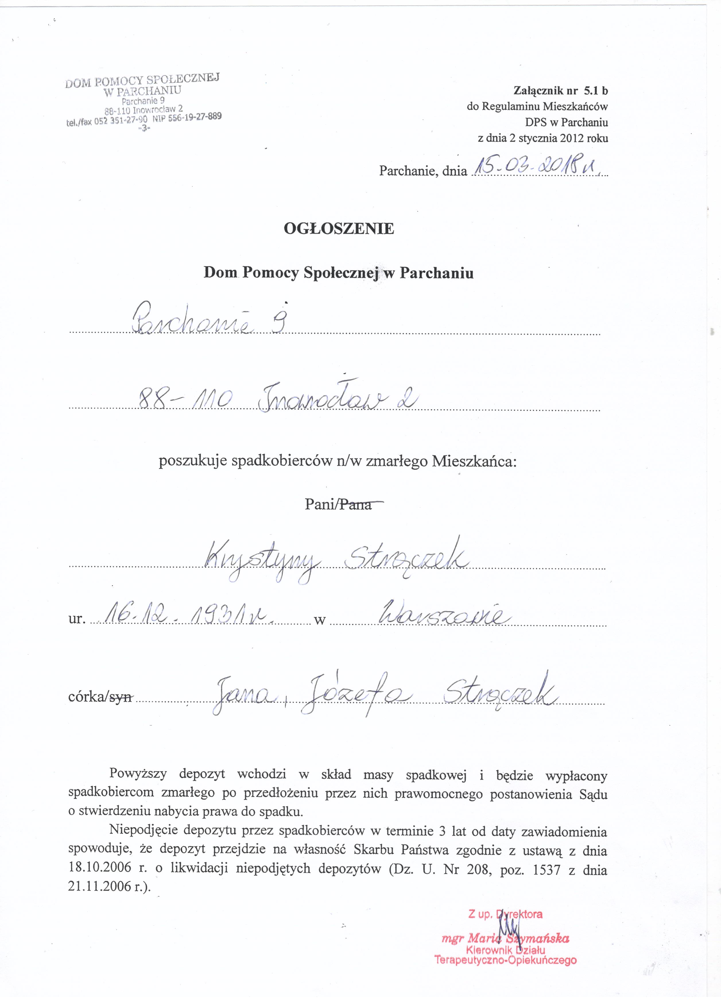 | Og艂oszenie o poszukiwaniu spadkobierc贸w zmar艂ych mieszka艅c贸w DPS w Parchaniu |