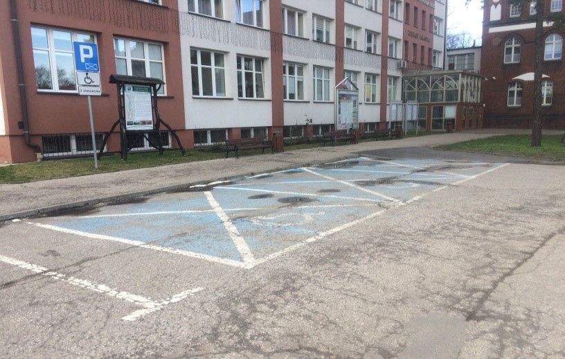 Przy wejÅ›ciu B do budynku wyznaczone sÄ… miejsca parkingowe dla osób niepeÅ‚nosprawnych.