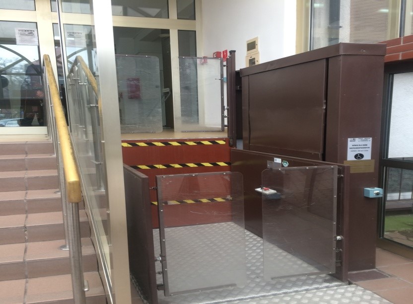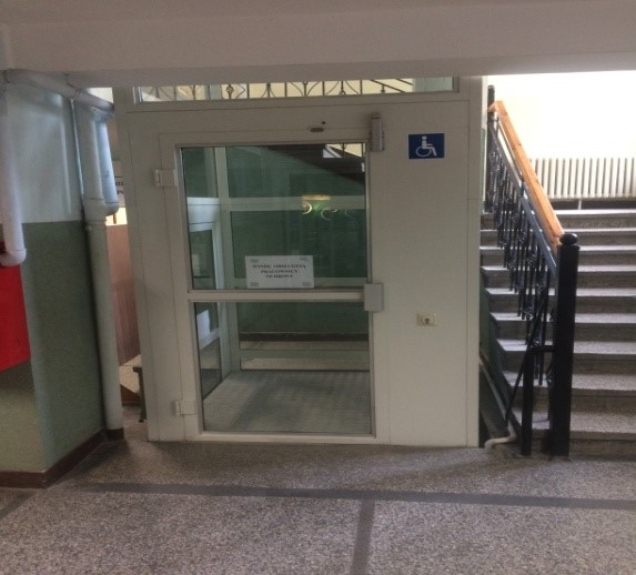 WejÅ›cie B do budynku od strony lewej wyposażone jest w przycisk dla osób niepeÅ‚nosprawnych pozwalajÄ…cy przywoÅ‚ać ochronÄ™ budynku, która obsÅ‚uguje i pomaga skorzystać z platform lub windy.