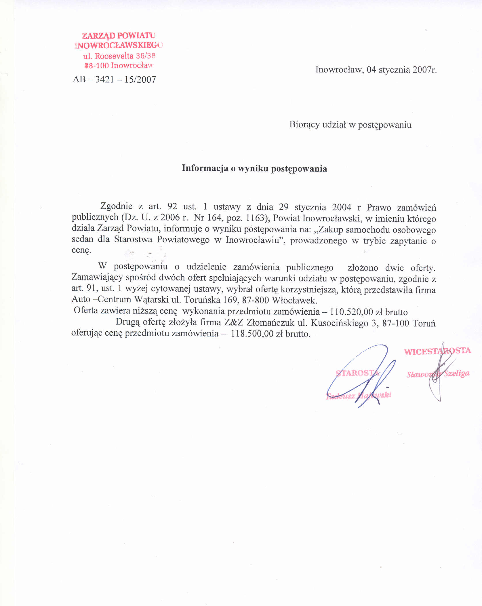 Zakup samochodu osobowego sedan dla Starostwa Powiatowego w Inowroc艂awiu.