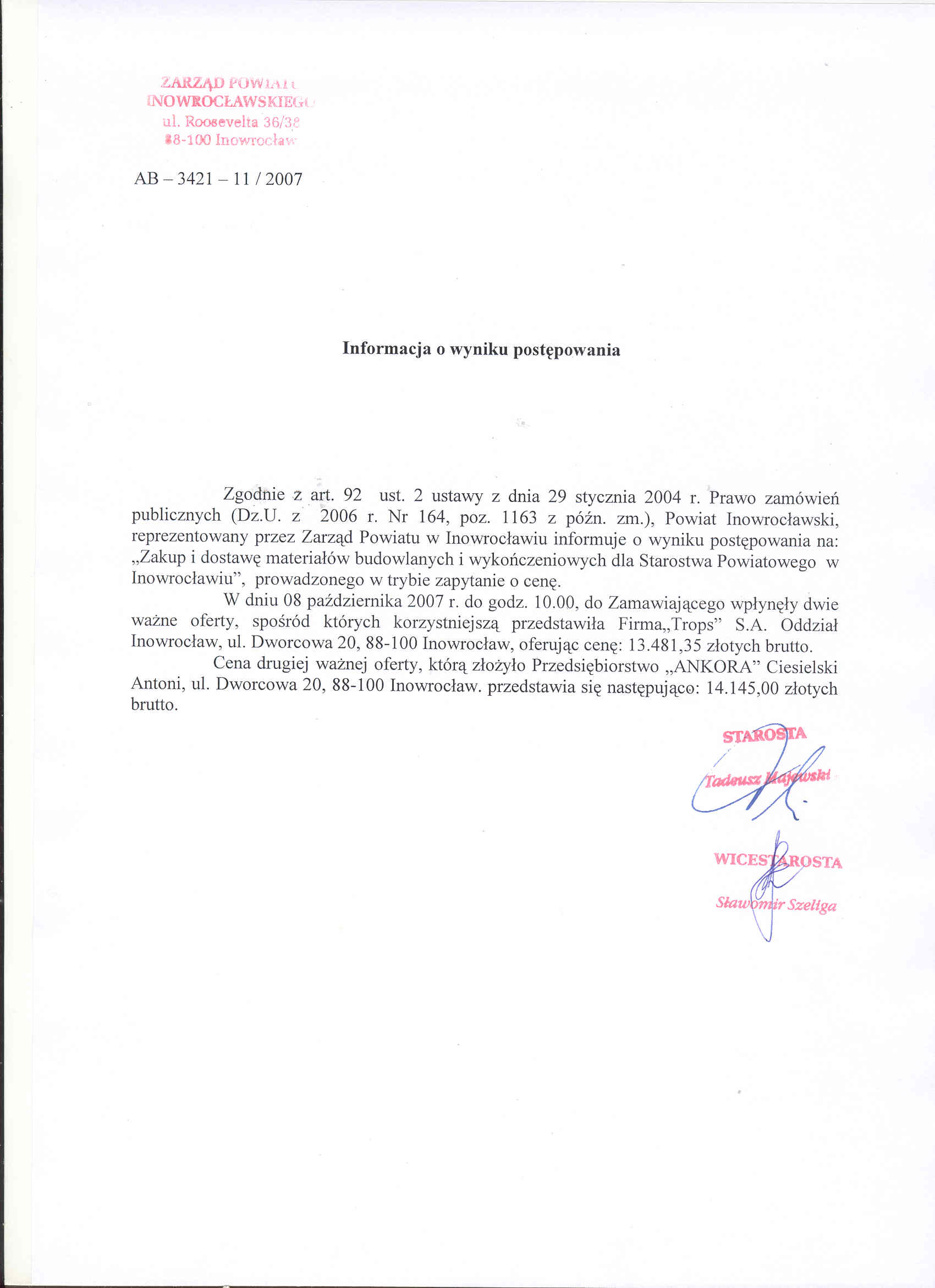 Zakup i dostawa materia艂贸w budowlanych i wyko艅czeniowych dla Starostwa Powiatowego w Inowroc艂awiu.