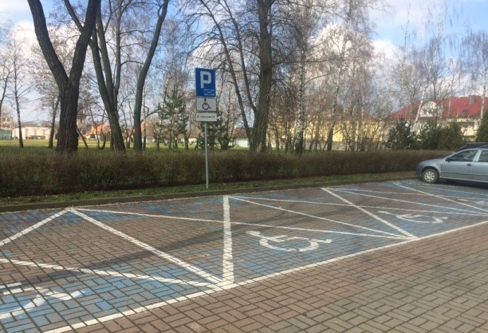 Przy wejÅ›ciu B do budynku wyznaczone sÄ… miejsca parkingowe dla osób niepeÅ‚nosprawnych.