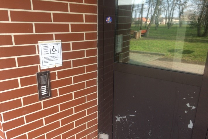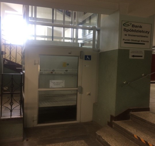 WejÅ›cie B do budynku od strony lewej wyposażone jest w przycisk dla osób niepeÅ‚nosprawnych pozwalajÄ…cy przywoÅ‚ać ochronÄ™ budynku, która obsÅ‚uguje i pomaga skorzystać z platform lub windy.