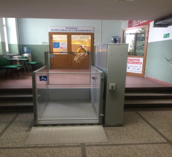 oraz sali obsługi Wydziału Komunikacji i Transportu korzystając z dźwigu i platformy.